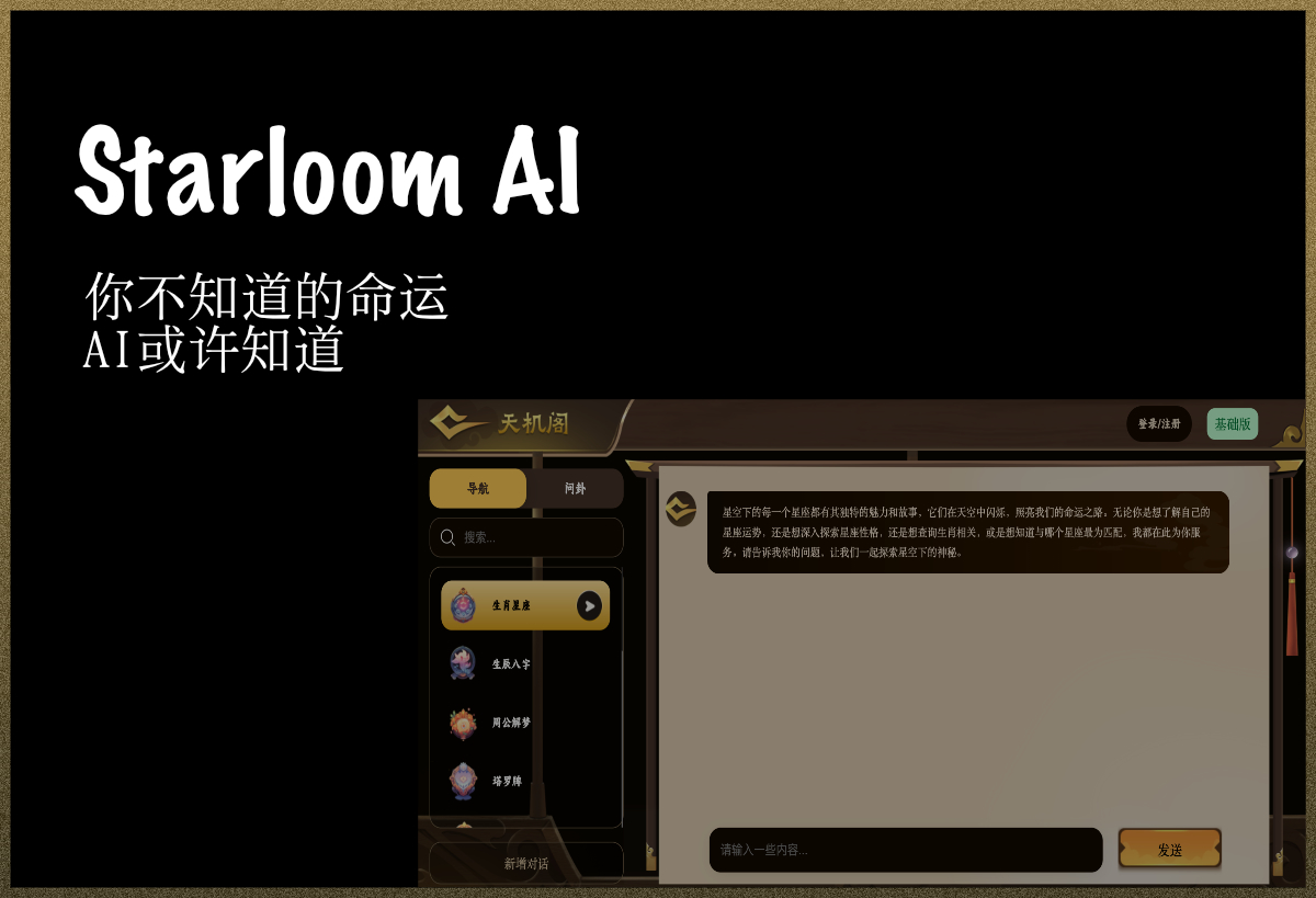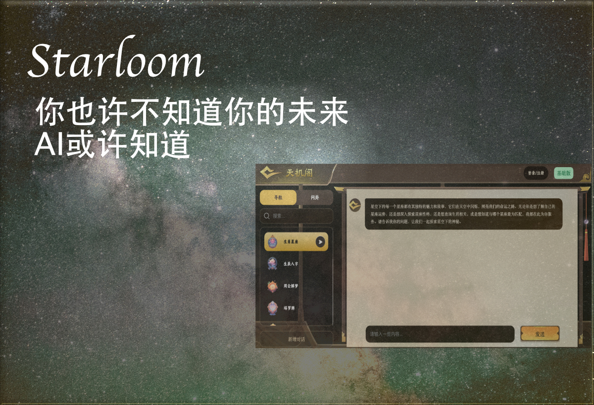 欢迎来到StarLoom,一个由数据驱动的前沿占卜系统。深入探索宇宙的奥秘,探索您的星座,并揭开命运的秘密,所有这些都得益于人工智能的帮助。 Starloom涵盖从远古龟卜、蓍占;到汉唐以来的周易八卦、八字算命、六爻算卦、梅花数;以及民间流传的称骨算命、抽签、测名、解梦等,同时亦有从西方传入的星座运程、塔罗牌占卜等,一个博古今,占未来的AI助手。